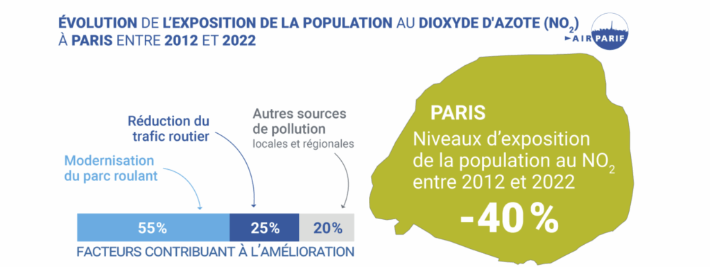 Airparif confirme ainsi que les politiques publiques menées sur le trafic améliore significativement la qualité de l’air, permettant une moindre exposition aux polluants .